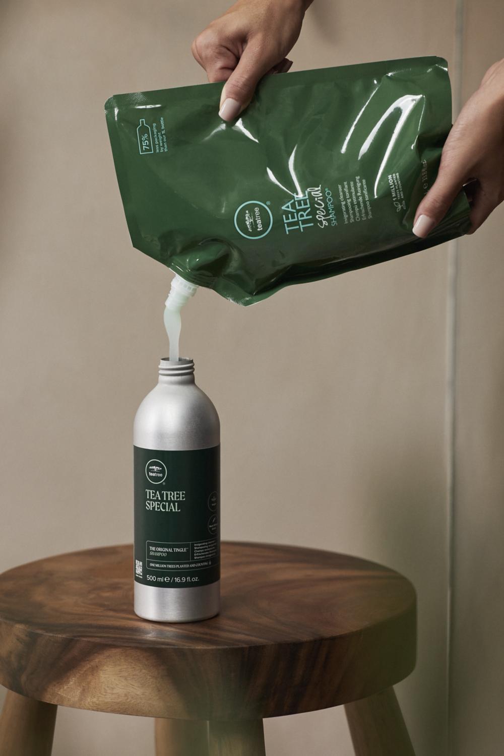 Refil vrečke iz linij Tea Tree in Paul Mitchell, ki vsebujejo 30 % reciklirane plastike (PCR), so zasnovane tako, da zmanjšajo odpadke, porabo vode, uporabo plastike in emisije toplogrednih plinov.†† Poleg tega manjša embalaža pripomore k optimizaciji prostora in finančnim prihrankom, saj je cenejša v primerjavi z uporabo plastičnih steklenic.